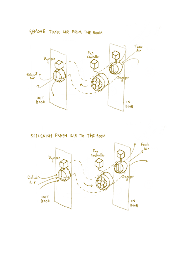 In a nutshell what I’m proposing is to have a return air fan and a set of separate dampers that will open at the dangerous CO levels event to let toxic air out and fresh air in. The fan needs to be big or powerful enough to recycle the room’s air fast enough. A better option is to be a little less radical and have the system detect CO early on and start moving air out before it becomes dangerous. In either case I need to make a hole on the wall or on a window for the air to flow in/out without having to depend on a sack of flesh (the human) to open the windows.