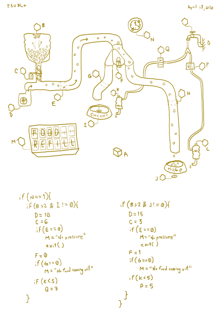A vibration sensor (sensor E) detects whether food is hitting the walls of the pipes. If no vibration is detected that means no food is in the pipes and something must be wrong: Either no pressure or no food. We output an error message to the message board (actuator M) and exit the program. Sorry dogs, no robot serviced food for you today.